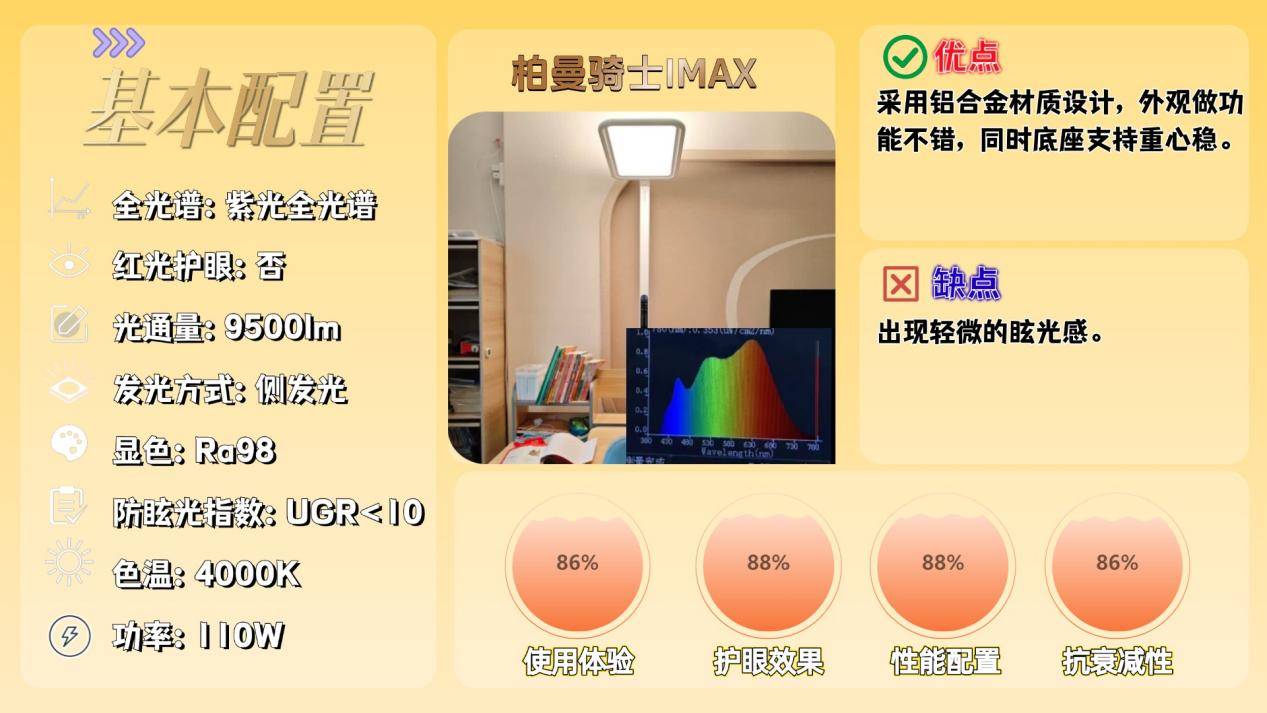 最后是柏曼骑士IMax,这是一款采用紫光激发全光谱的护眼灯,实际蓝光在一个安全的范畴,并且光谱连续性高。
