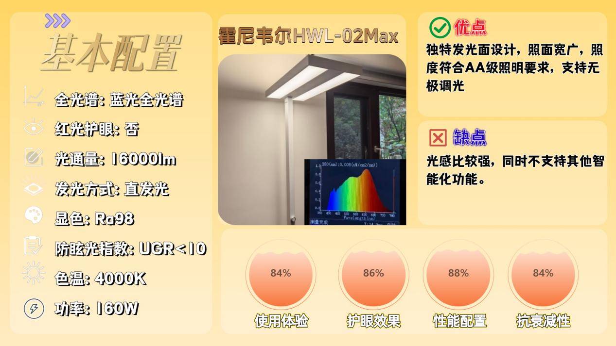 其次是霍尼韦尔HWL-02Max,这款护眼大路灯实际蓝光在0.6左右,也符合一个RG0蓝光标准,并且光谱连续性还不错,但是比较遗憾的是并没有补全红光。
