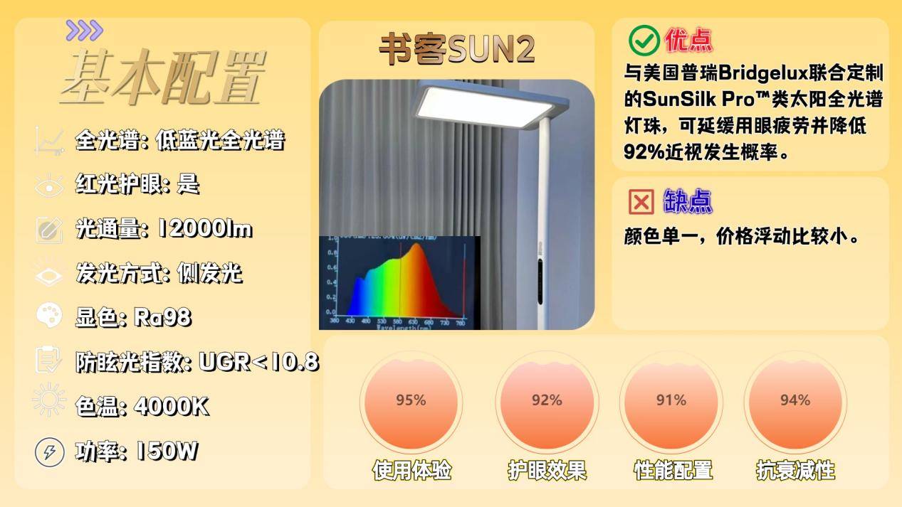 其中书客SUN2呈现的是低蓝光(0.6),光谱连续以及红光饱和的分布,实际光线自然舒适接近太阳光,对此我深挖了一下书客SUN2这款护眼大路灯,这是因为书客搭载与美国普瑞Bridgelux联合定制的SunSilk Pro™类太阳全光谱灯珠,科学调控光源,从源头实现光谱优化,并结合RRT2.0红光护眼技术,实现减少视觉刺激,可延缓用眼疲劳并降低92%近视发生概率。
