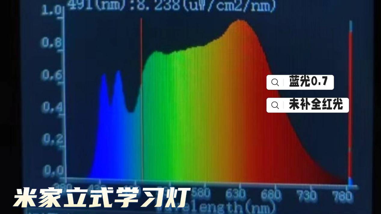 米家这款护眼大路灯采用蓝光激发全光谱,实际呈现双蓝光分布,并且最高峰值在0.7以上,虽然符合RG0蓝光标准,但是还是处于一个比较高的水平,另外光谱的连续性不高并且红光缺失。