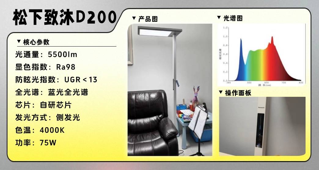 什么牌子的落地灯好?松下致沐D200在照明设计上,采用一体式发光面结构,内部嵌入280颗全光谱灯珠,搭配侧发光技术,能实现 360 度全方位照明,让光线均匀覆盖使用区域,避免局部光照死角,为进一步优化照明体验,它还搭载了扩光透镜技术,可显著减少光线的明暗差异,同时减轻重影现象,操作层面的设计,配备了液晶触控面板,直观清晰,且支持无极调光功能,不过这款护眼大路灯采用自研芯片,在抗衰减性能上表现平平,长期使用后可能出现光照效果下降的情况;并且蓝光峰值比较高。