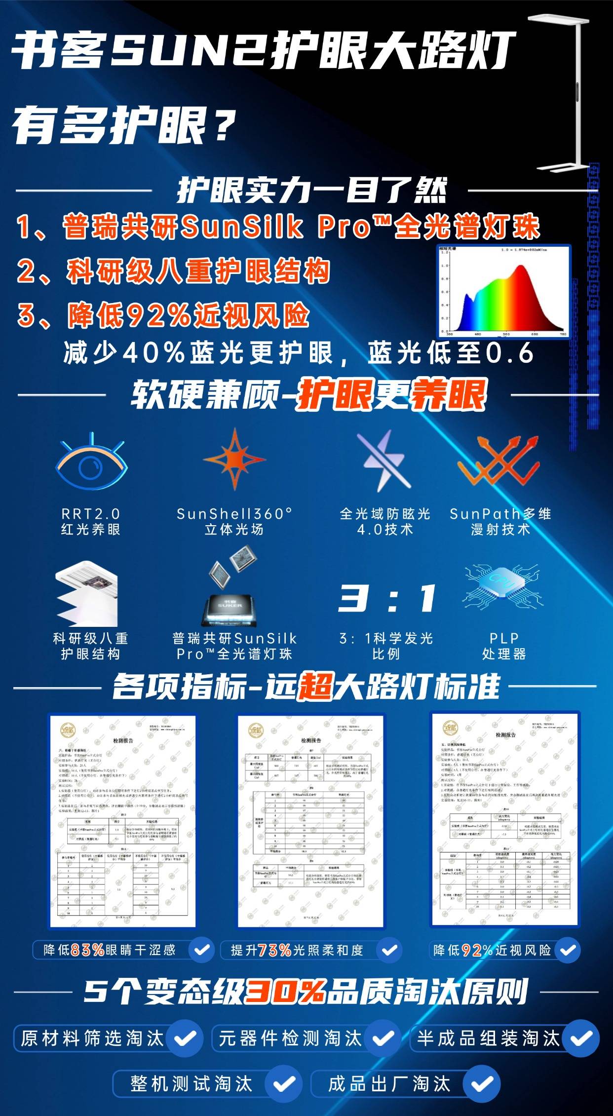 护眼性能:采用自研第7代SunMaster紫光原芯,集「控·护·养」一体,从发光原理实现低蓝光,蓝光含量降低60%;并结合RRT2.0红光增益养眼技术,可缓解94%视觉疲劳,降低98%近视风险;采用德国进口BASF眩光抑制膜实现UGR≤9.2的低眩光,直视光源舒适不刺眼。