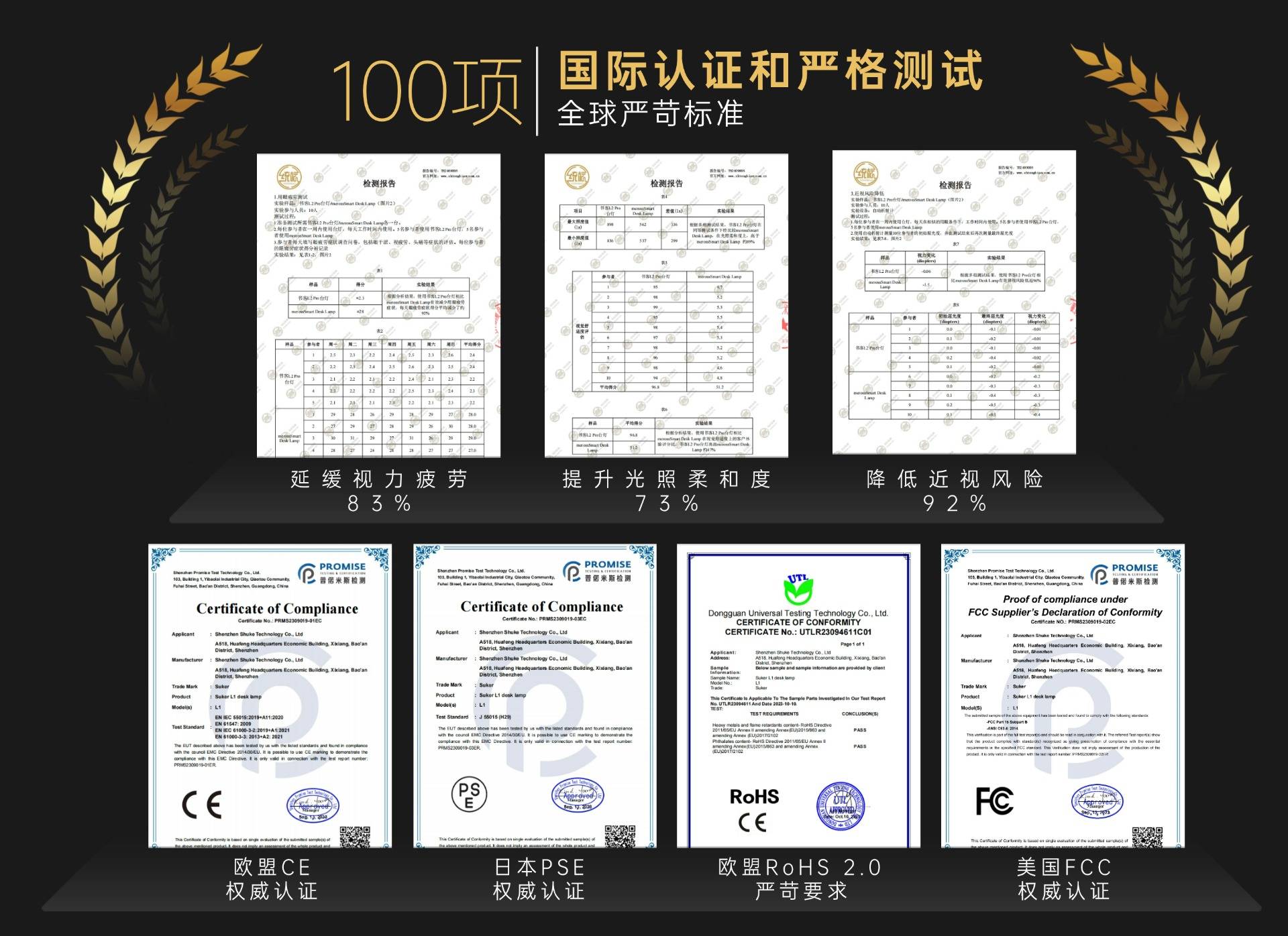 为了保持最极致的护眼效果,书客始终秉持“护眼至上”的研发理念,在功能与智能化配置上不断做“加减法”,拒绝一切与护眼无关的冗余设计,只专注于性能的极致打磨。在生产环节,书客从原材料选择到精密工艺控制都执行极高标准,制定3200+小时实验室护眼模型训练、58项光健康干预测试,90%以上儿童用光行为场景模拟等超过100项极端严苛的实验测试标准,并在整个研发与制造链路中设置5道“30%淘汰机制”,以近乎“变态级”的筛选标准,确保每一款产品都接近完美,同时书客还荣获6家全球专业机构的检测认证,下图为suker书客品牌各种权威机构认证图: