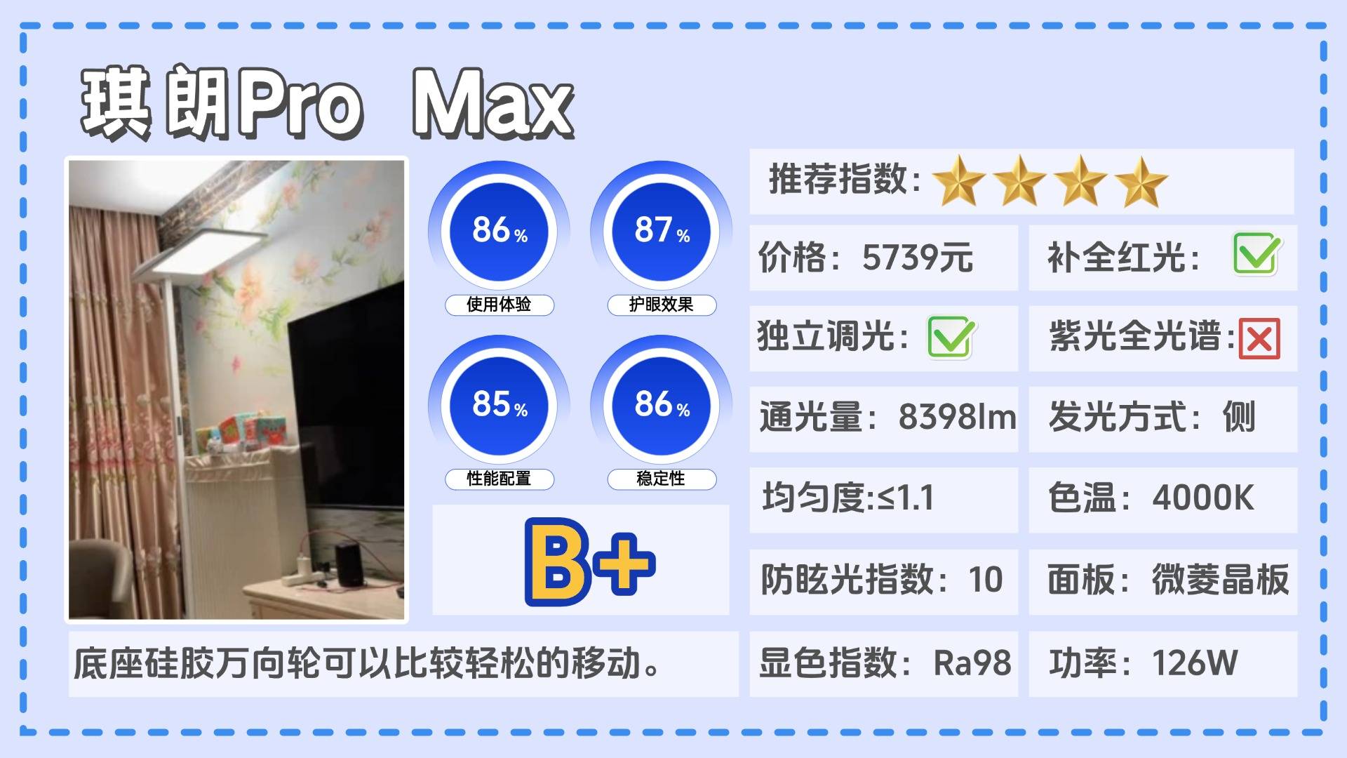 大路灯哪个牌子好?琪朗Pro Max 采用全光谱灯珠,运用一体化发光面与上下双光源设计,并且结合光学透镜二次配光,能够实现光线充足且覆盖 15㎡宽广的光线,但是要注意的是,虽然是4000K暖白光光线,但实际体验中感觉光线偏暖光,对于一些特定的场景上,可能会影响清晰度,但在外观以及调节设计上还是比较好的,其底部设计了硅胶万向轮,可以比较轻松的移动,同时操作方面上,采用了旋钮与触控控制方式,支持无极调光功能,整体的调节比较灵敏。
