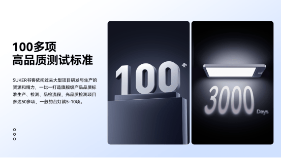 SUKER书客在设计这款护眼大路灯时,充分考虑青少年的用眼习惯与对舒适照明的需求,力求打造前所未有的光照体验。产品实现了旗舰级Ra99色彩还原度、SDCM(色容差)≤2.4,配备高频率无频闪的PLP光电处理器,波动深度控制在≤0.05%,完美消除频闪危害。严格遵循RG0无蓝光危害标准,有效保护眼睛免受蓝光伤害,同时满足TM-30光学标准,实现Ra98高显色与Rf≥99色彩逼真度,呈现自然真实的光色效果。无论是学习还是阅读,这款台灯都为青少年提供了最舒适、最安全的护眼环境,是同规格下“盲入不会错”的顶级护眼选择。