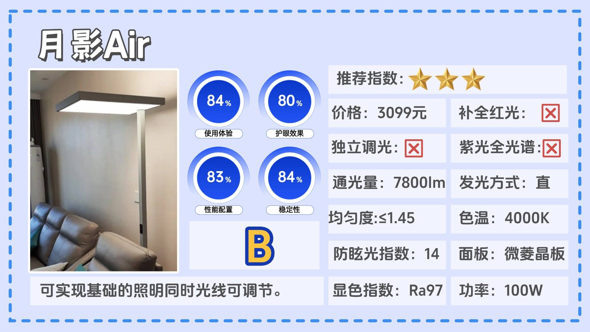 大路灯哪个牌子好?月影Air作为一款主打基础照明需求的护眼大路灯,采用一体式发光面设计,能够实现大面积且均匀的光线覆盖,防眩光指数控制在 UGR≤14,具备一定的防眩光效果;功能上配备无极调光功能,可根据不同时间段和使用场景灵活调整亮度,材质方面则选用航空铝材打造灯体,兼顾坚固性与耐用性。不过受基础款产品定位影响,它也存在明显局限:智能功能配置相对较少,同时因采用直发光方式,实际使用中不仅光线强度偏高,还存在轻微眩光问题。