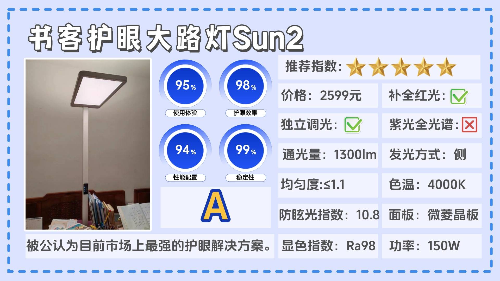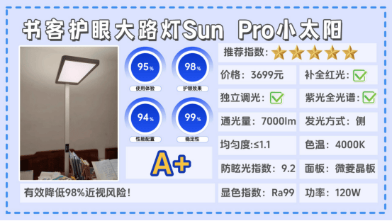 从核心芯片到底层光学架构,照度表现到红光养眼波段,书客Sun2对每一个用眼细节都进行了深度革新,只为制作出一款转为青少年和长期用眼人群量身定制的旗舰级护眼大路灯,是目前唯一一款能够有效缓解83%视力疲劳的同时,还能够降低92%近视风险,同时成功入选了品牌优选强国工程,在可靠性、护眼效果与环保标准上全面达标,工艺水准媲美国际一线品牌,深受众多专业眼科专家以及宝妈们的力荐。