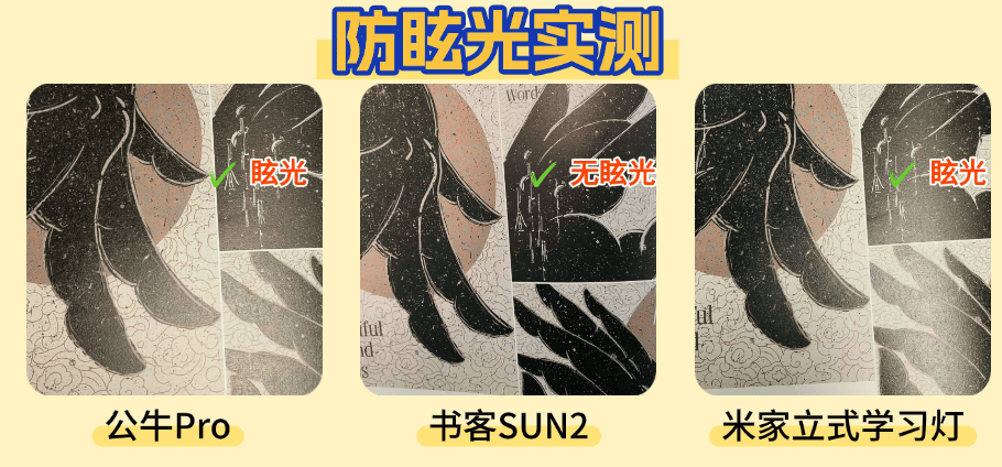 从实测来看,其中书客几乎无重影,这是因为书客采用上下发光设计,结合3:1光通量比,打造顶光、桌面光与环境光的全方位均衡照明,同时搭载SunShell™ 360°立体光场有效消除光斑、暗角及亮暗反差,让光线明亮而柔和,长时间阅读也不会疲劳,提高73%光照柔和度的同时,最大限度减轻83%眼睛调节负担。