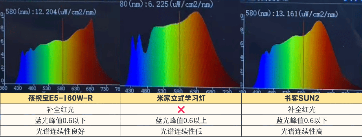 从上图光谱图中,我们可以很清晰的看到光谱表现,其中书客SUN、孩视宝E5-160W-RS这两款的光谱表现都比较好,蓝光峰值在0.6以下且补全了有效护眼红光,而米家则是呈现双蓝光,实际蓝光在0.7以上,并且光谱连续性不佳,在一定程度上可能会影响视觉疲劳。