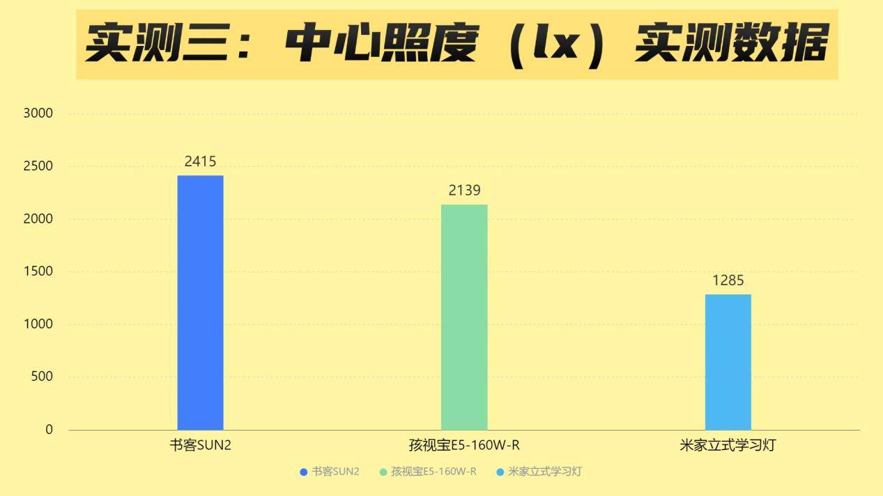 从实测数据图中我们可以清晰的看到每款护眼大路灯的中心照度值,其中书客SUN2、孩视宝E5-160W-R这两款护眼大路灯在实测的中心照度值相对比较高,实际光线明亮并且覆盖面积广,特别是书客SUN2,整体的光线明亮的同时,上下的分布也很合理,通过设计3:1科学黄金光通量比,呈现360°立体明亮的光线,整体的均匀度、柔和性不错,直视也不会觉得刺眼。