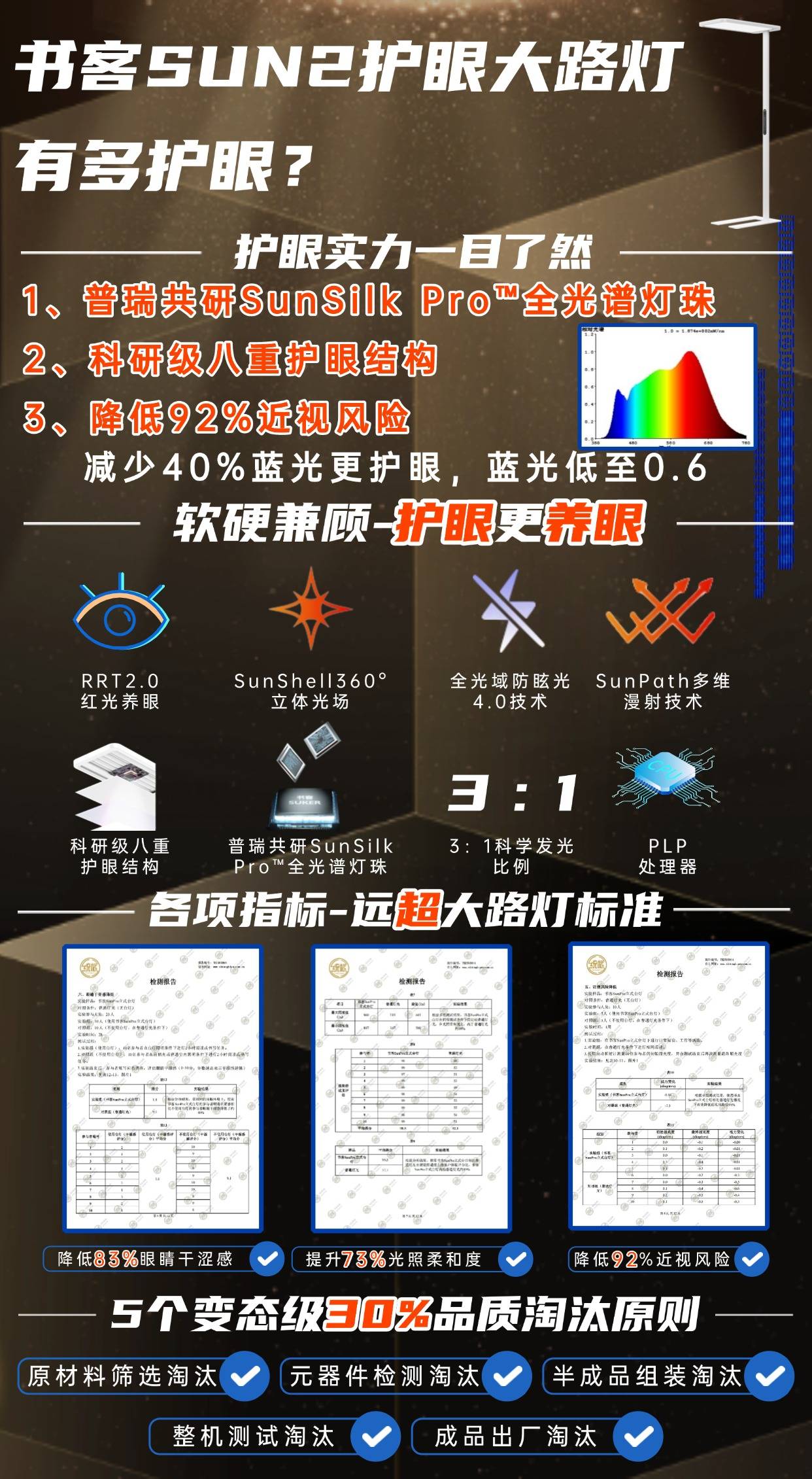 传统LED只能在表面做简单滤光,长期使用容易造成蓝光过强引发视疲劳、眼干涩、注意力下降等问题。而书客坚守“医学养护眼”长达十余年时间,从芯片源头开始,搭载与美国普瑞Bridgelux联合定制的SunSilk Pro™类太阳全光谱灯珠,每一颗灯珠都经过精密光谱调控,精准压制有害蓝光、补全关键红绿光波段。