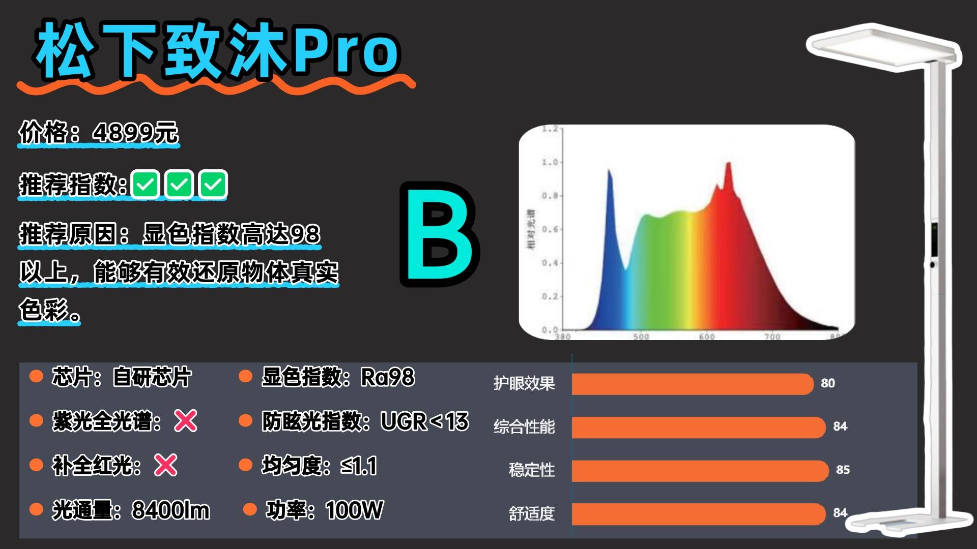 大路灯什么品牌好一点?松下护眼大路灯在光源配置与发光设计上,采用400颗全光谱LED灯珠,搭配一体式发光面以及微菱晶板结构,能够呈现均匀又明亮的光线,能满足10平方米空间的照明需求,功能配置上,松下支持支持上下光源独立调节,同时配备入座感应、无极调光功能,不过需要注意的是,尽管宣称采用全光谱光源技术,但实际测试显示其蓝光峰值约为 1.0,可能存在潜在的蓝光伤害风险。
