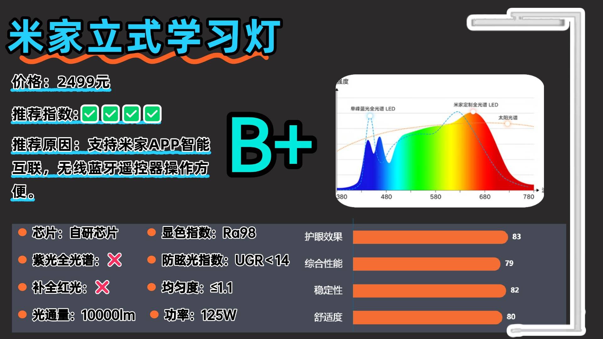大路灯什么品牌好一点?米家是一款外观符合人体工学设计的护眼大路灯,白色的外观发光面灯杆前伸设计,并且支持90°旋转调节,在光源上,米家通过蓝光激发技术,能够将蓝光控制在符合RGO蓝光标准,不过从光谱分布来看,米家实际蓝光在0.7左右,光谱连续性不高,实际连续性比较低,并且未补全红光,总体来说,这款护眼大路灯适合追求智能化体验的伙伴去选择,功能上支持米家APP以及小爱音箱互联,同时支持遥控器无极调光。