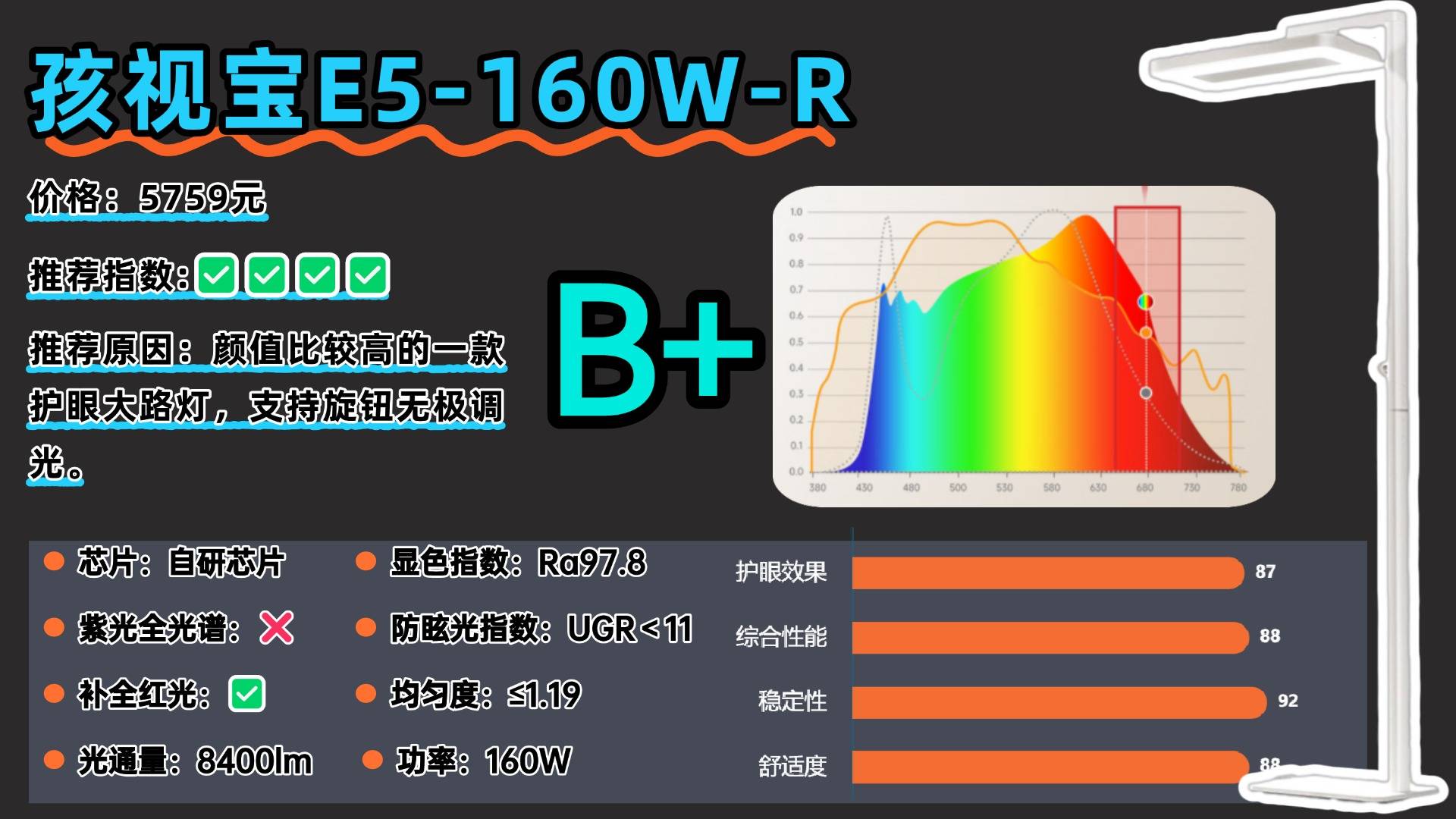 推荐款:孩视宝阳光灯E5-160W-R——具备入座感应功能,同时可以旋钮无极调光。